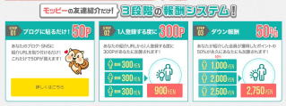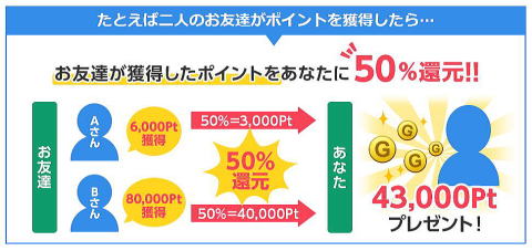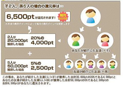 ![]() 紹介した友達が獲得したポイントの何% かが永久にもらえるんです。 更にその友達が紹介した 『友達の友達』(孫)の分の 何%までもらえるという超システム。 紹介する人数により 1紹介で250P還元 2ティア35% 3ティア12.25% が還元されます。 |